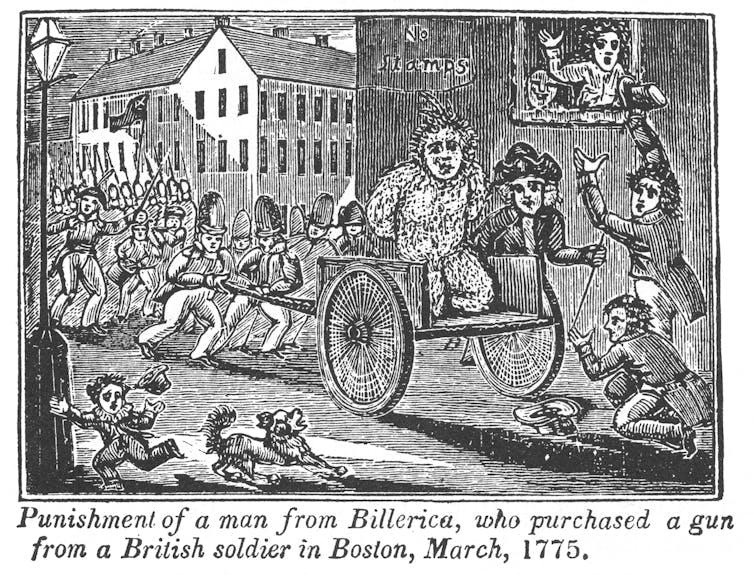 In seaport towns such as Boston and New York, mobs stripped political enemies, usually suspected loyalists – supporters of British rule – or officials representing the king, smeared them with hot tar, rolled them in feathers, and paraded them through the streets.